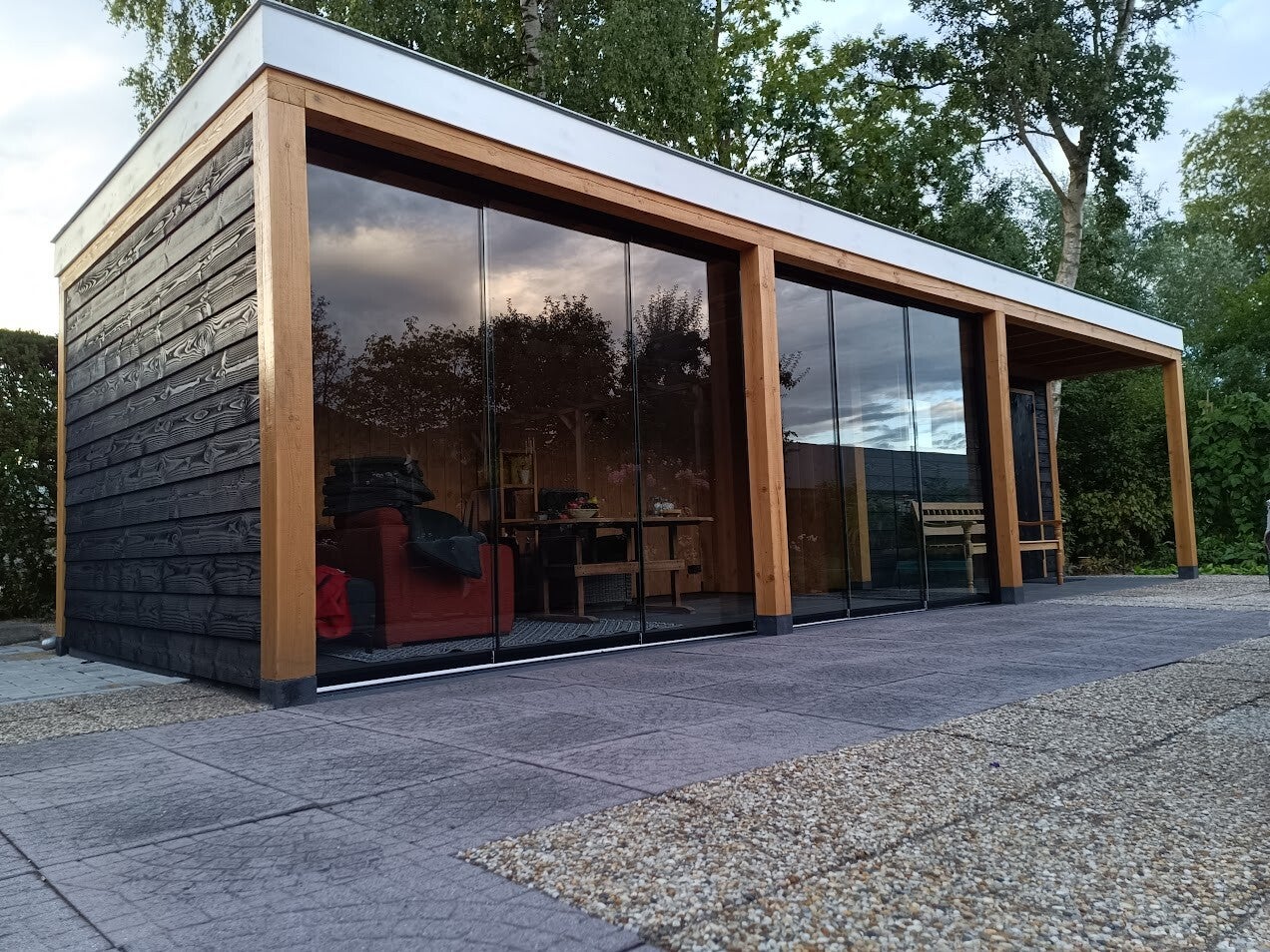 Uitvoering: douglas basis, berging zwart, glazen schuifwanden, volledig geisoleerd