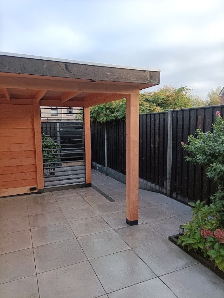 Uitvoering: douglas basis, shutter zwart, blank zweeds rabat, dakrand spots